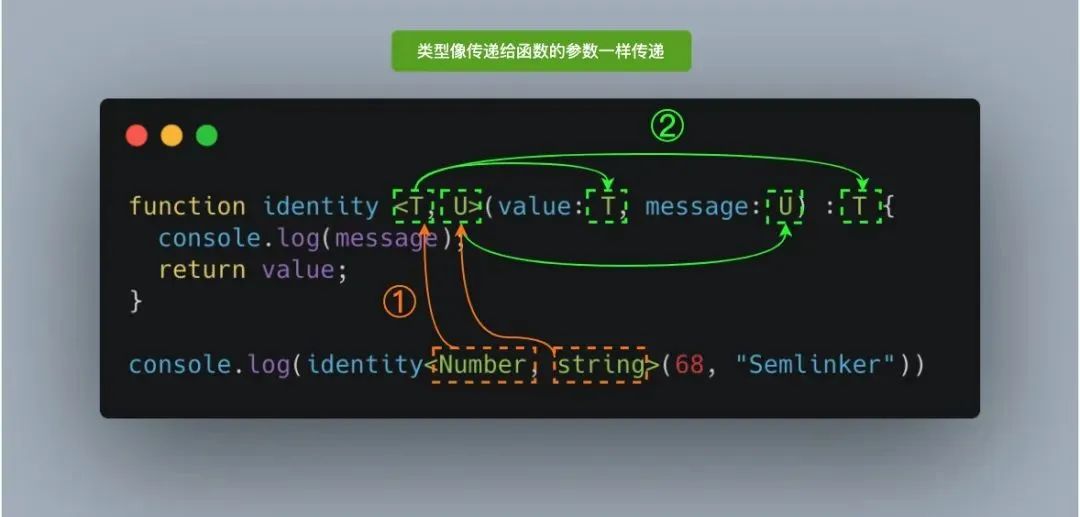 当我们调用 identity<Number>(1) ,Number 类型就像参数 1 一样,它将在出现 T 的任何位置填充该类型。图中 <T> 内部的 T 被称为类型变量,它是我们希望传递给 identity 函数的类型占位符,同时它被分配给 value 参数用来代替它的类型:此时 T 充当的是类型,而不是特定的 Number 类型。